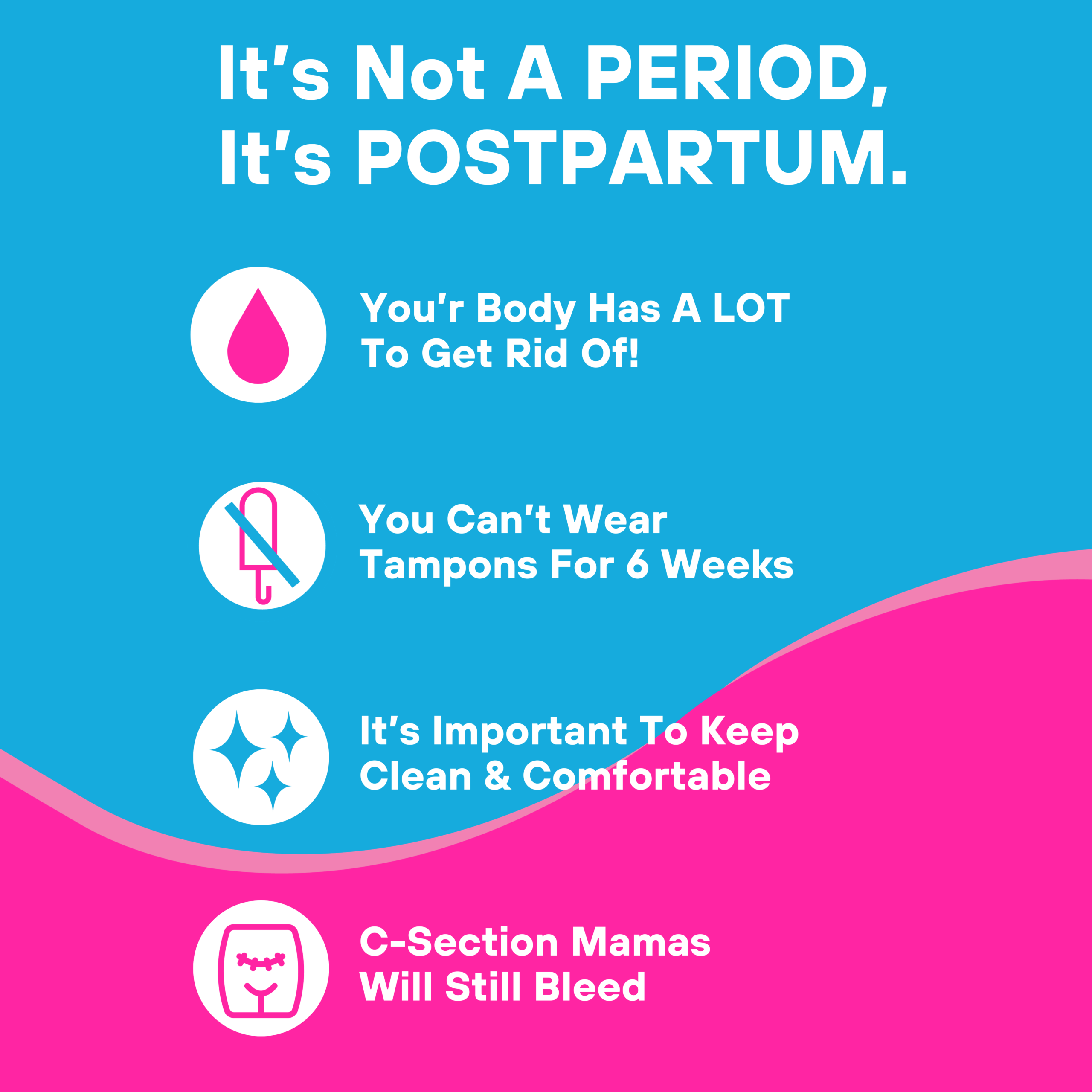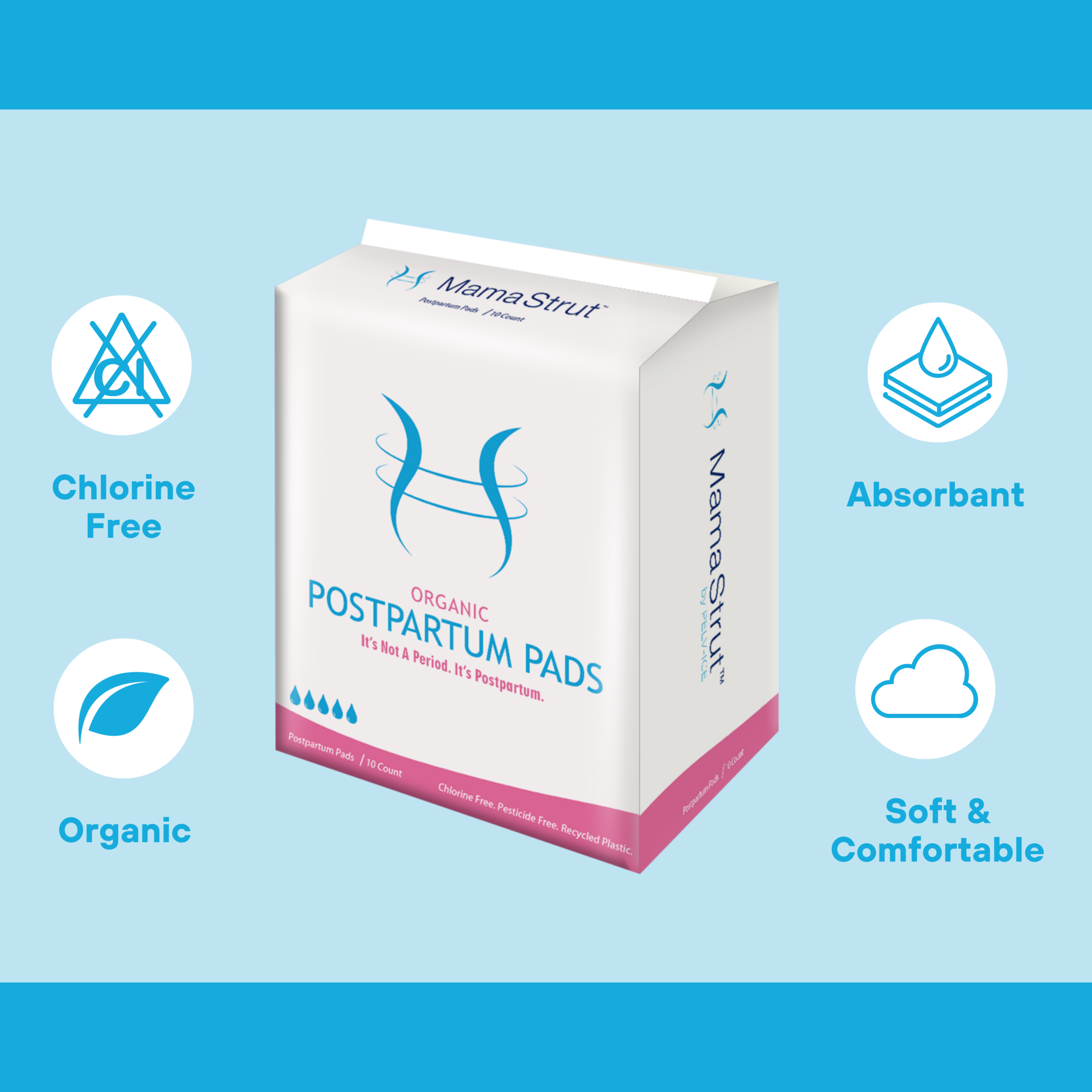 Why Postpartum Pads? You’ve spent the past 9 months pregnant and without a period, now you’re about the have one of the heaviest flows of your life. Mama Strut Postpartum Pads keep you comfortable and confident all through the day and night. You have enough diapers to change, one of them shouldn’t be yours. 10 postpartum pads per pack.>
